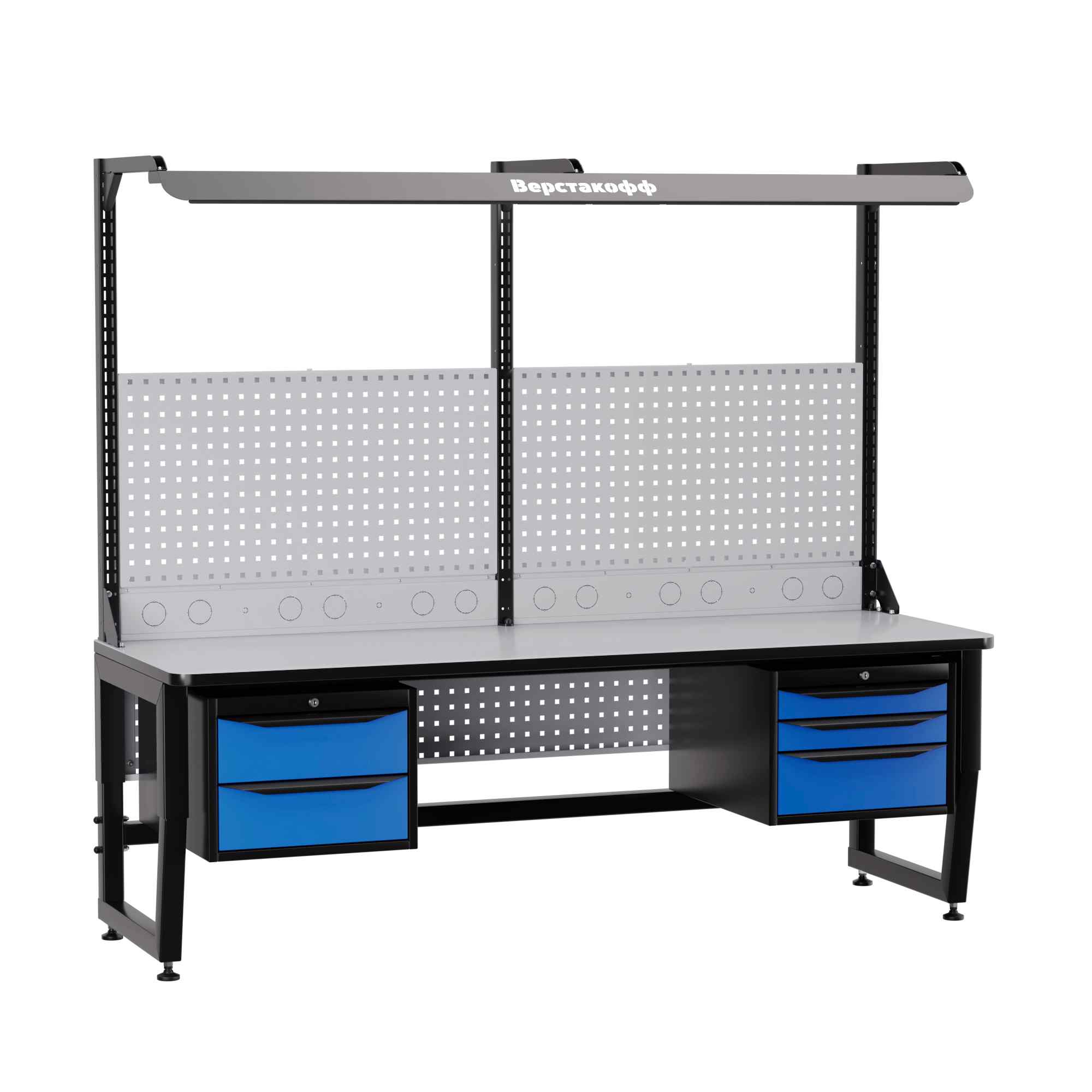 Для наилучшей освещенности при работе с мелкими электронными компонентами рабочее место комплектуется блоком освещения. В его составе - специальный промышленный светильник с необходимой цветовой температурой и световым потоком, обеспечивающим оптимальные условия работы. Блок освещения располагается над рабочей поверхностью на регулируемых (по высоте и по вылету) кронштейнах