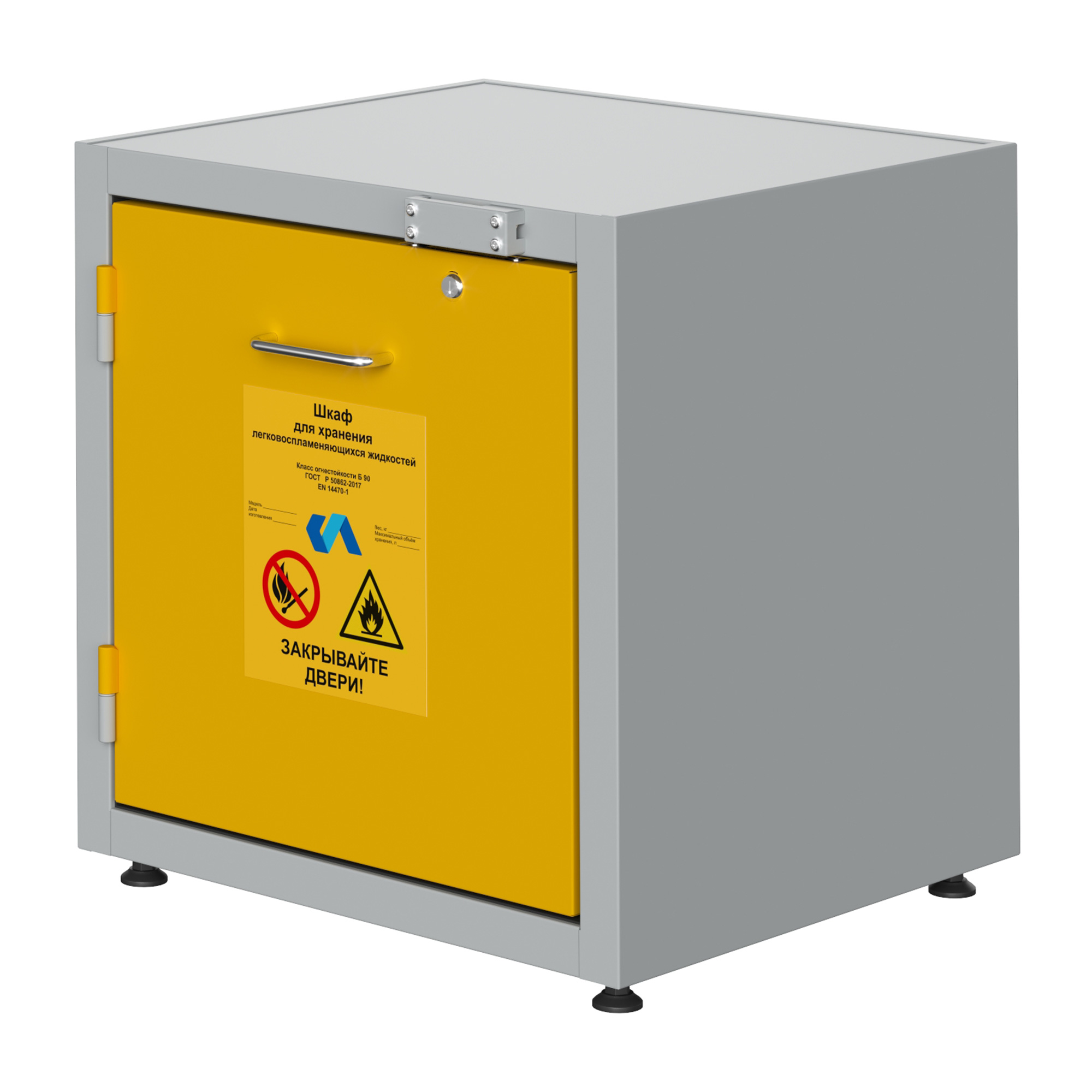 Испытания шкафа для хранения ЛВЖ на возгорание были произведены в аккредитованных лабораториях, в соответствии со стандартом ГОСТ  Р 50862-2017. Шкаф изготовлен из стали толщиной 1,2 мм с и окрашен противокислотной порошковой эпоксидной краской,  при температуре полимеризации 200° C. Толщина слоя краски составляет минимум 60 (микрон) и максимум 250  (микрон), в соответствии с требованиями ГОСТ  9-410-88 .Шкаф для хранения ЛВЖ обладает монолитной цельносварной конструкцией. Новая техника изготовления с двойной оболочкой, состоящей из двух корпусов, внутреннего и наружного. Новая огнеупорная изоляция, выполненная из экологически безопасного материала, характеризующегося высочайшей огнеупорностью.  Внутренний корпус с панелями из не царапающегося материала, устойчивого к действию коррозийных веществ.  Терморасширяющаяся прокладка 7 + 4 см, увеличивающаяся в объеме в случае пожара, полностью изолируя внутреннюю часть шкафа от внешней среды.   Дополнительная терморасширяющаяся прокладка для защиты от пыли с защитой от “холодных и горячих дымов”.  Распашные дверки, поддон для хранения  из окрашенной эпоксидной порошковой краской электрооцинкованной стали, с противокислотной защитой, с решеткой, выполняющей роль полки. Объем сбора около 5 литров, грузоподъемность полки кг 80.  Закрытие распашной двери шкафа для хранения лвж с автоматическим возвратом при каждом открытии. Система внутренней не форсированной вентиляции для паров, укомплектованная двумя предохранительными клапанами с автоматическим закрытием при температуре окружающей среды 70 ± 10° C, находящимися внизу и вверху, чтобы гарантировать автоматический выход наружу веществ, в соответствии с требованиями норматив. Наружный соединительный фланец для подключения к системе вытяжной вентиляции, диаметром 100 мм. Система предохранительного закрытия , автоматически срабатывающая и удерживающая дверь закрытой в случае пожара.  Искробезопасные петли, расположенные по длине двери.  Предохранительный цилиндровый замок, запирающийся на ключ. Плакаты, предупреждающие об опасности наличия возгораемых веществ и запрете курения, в соответствии с российскими и европейскими нормами безопасности.  Клемма заземления на случай возникновения электростатического электричества.   Регулируемые ножки для установки шкафа в горизонтальное положение.  Руководство по эксплуатации и техобслуживанию.