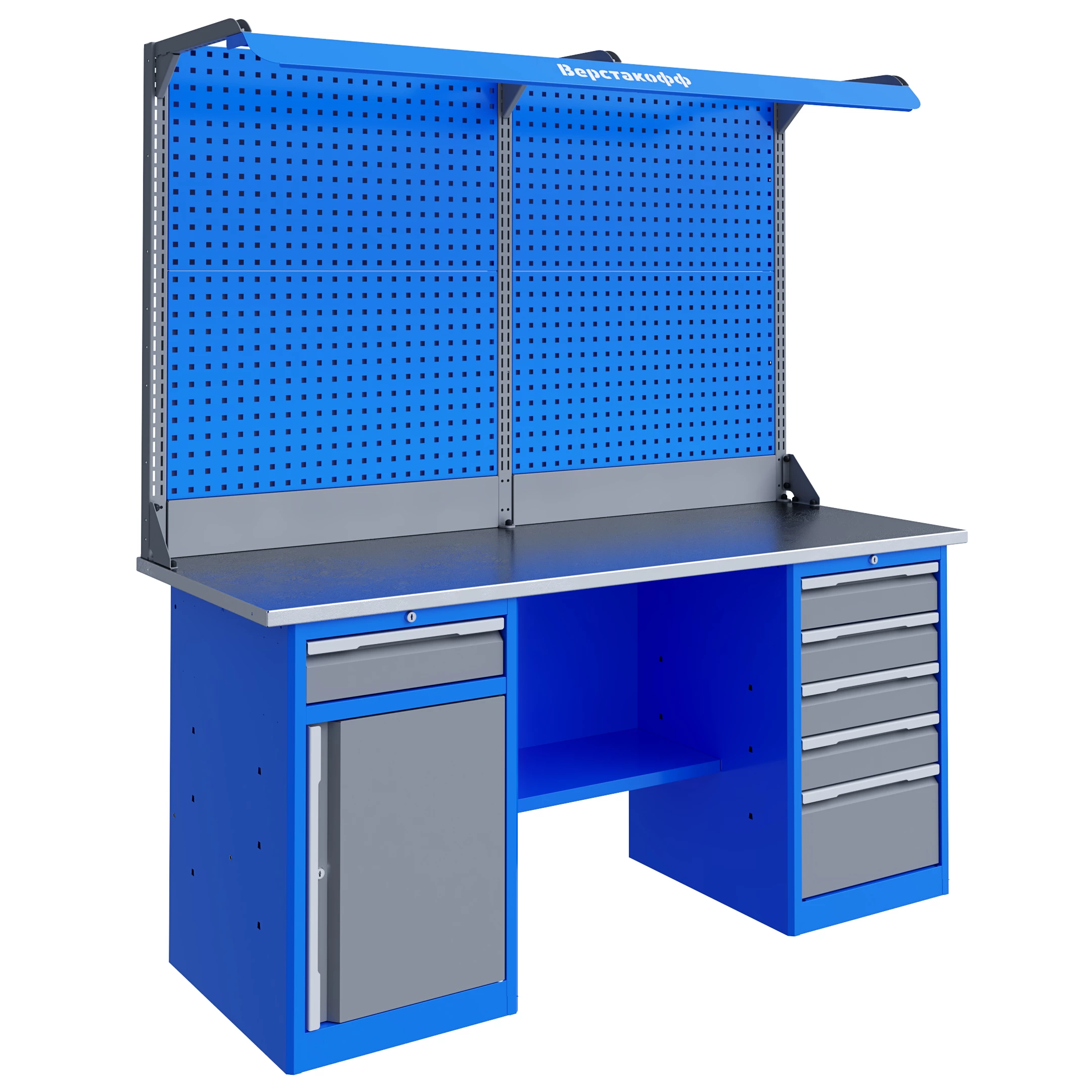 Верстак серии Technic 181.58.2-2F состоит из столешницы шириной 1796 мм, тумбы P5 с четырьмя малыми и одним большим ящиком, тумбы P8 с малым ящиком и отделением с дверью, полки-стенки, двойного экрана с кронштейнами и комплекта освещения.