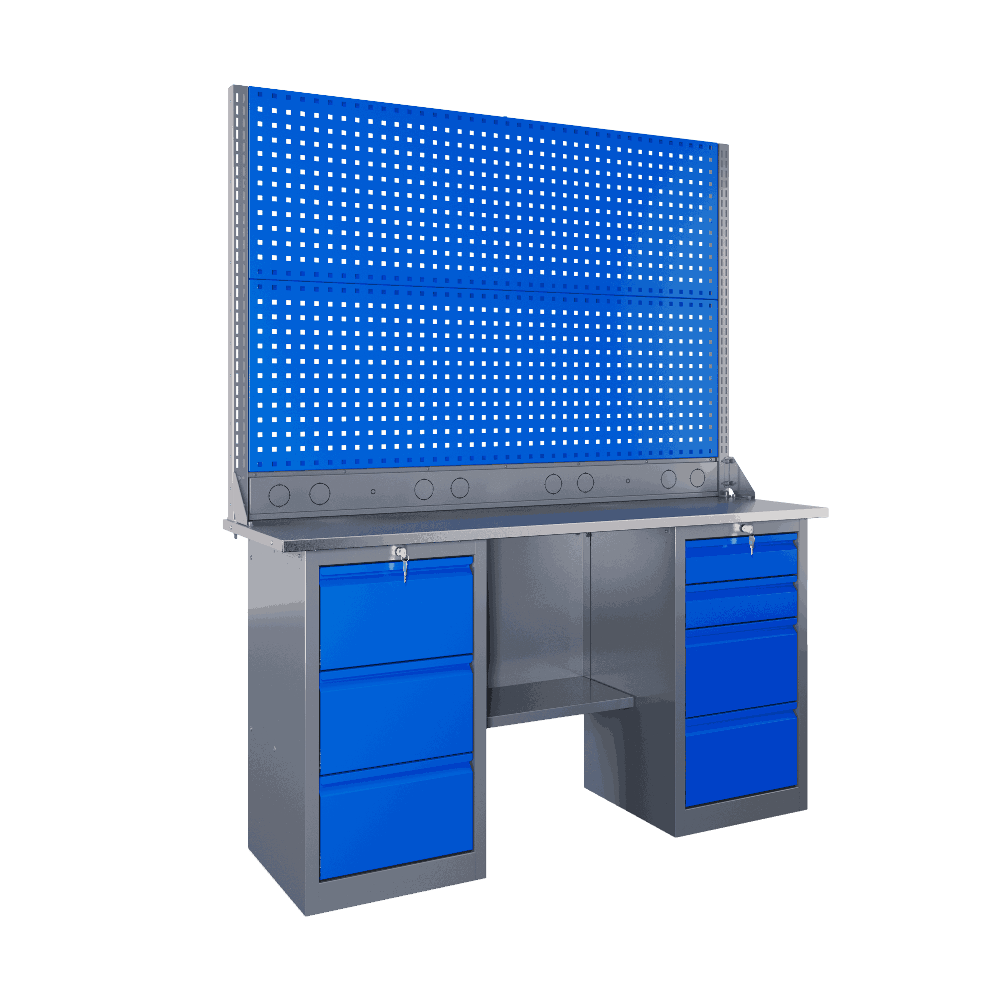 Самые компактные верстаки с глубиной столешницы 500 мм. Благодаря небольшой глубине, такие верстаки легко размещаются в ограниченных пространствах, например, в гаражах, мастерских и тд. Несмотря на компактные размеры, верстаки могут быть оснащены полками, ящиками и держателями для инструментов, что помогает поддерживать порядок и быстро находить нужные предметы.