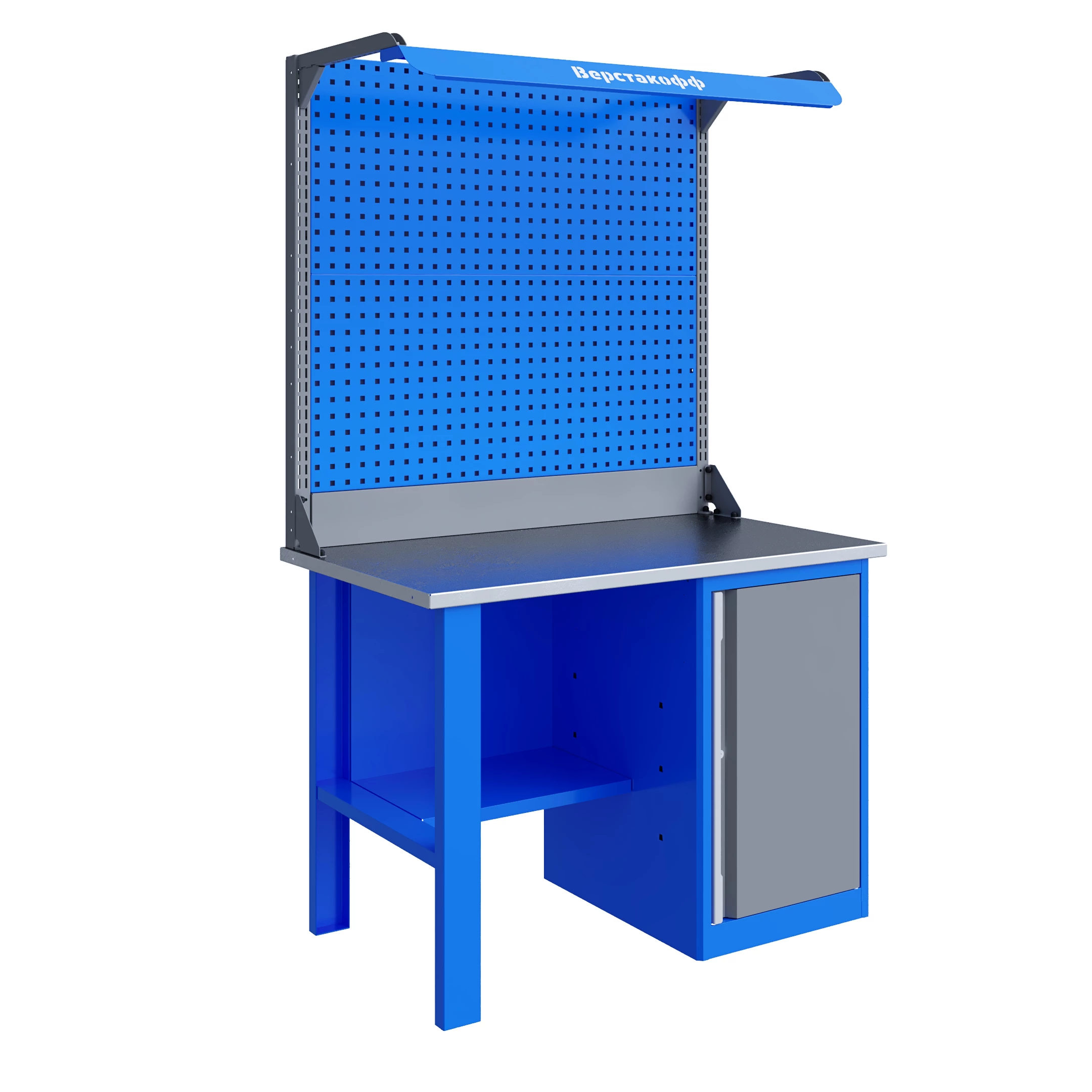 Верстак серии Technic 121.17.1-2F состоит из столешницы шириной 1196 мм, опоры, тумбы P7 с дверью, полки-стенки, двойного экрана с кронштейнами и комплекта освещения.